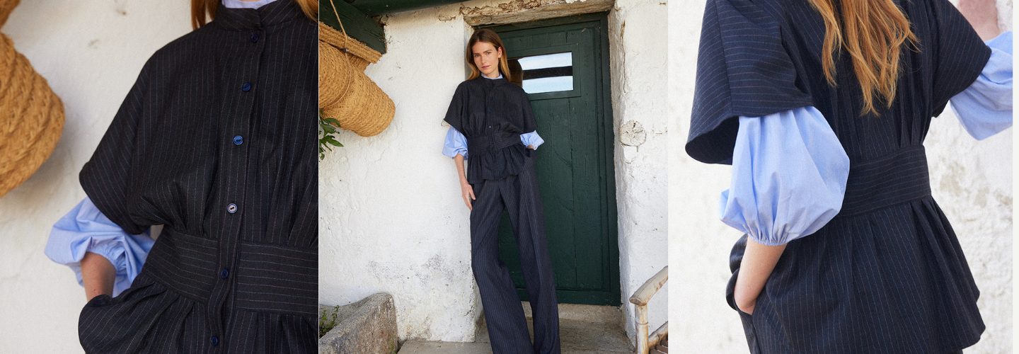 Vestido midi tipo pichi con escote en V y pinzas en pecho confeccionado en lana virgen. La falda cuenta con corte en la cintura y falsos bolsillos delanteros. Tiene forro interior y se cierra por la parte trasera con cremallera invisible.